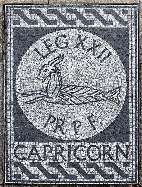 Legio XXII Primigenia Pia Fidelis (22. Legion, die Erstgeborene, pflichteifrig und treu) (aus Wikipedia) Die Legio XXII Primigenia war eine Legion der römischen Armee, die von Caligula im Jahr 39 für seinen Feldzug in Germania aufgestellt wurde. Berichte über die Legion in Mogontiacum (Mainz) gibt es noch vom Ende des 3. Jahrhunderts. Legionssymbole waren ein Steinbock und der Gott Herkules. Die XXII Primigenia war ab dem Jahr 43 in Mogontiacum in der Provinz Germania Superior stationiert. Ab dem Jahr 93 besetzte die Legio XXII Primigenia Pia Fidelis (später mit den Ehrennamen Antoniniana, Severiana und Constantiniana Victrix) als einzige Legion das Legionslager bis Mitte des 4. Jahrhunderts, eventuell in Teilen auch bis zum Anfang des 5. Jahrhunderts. Ihre Aufgabe war die Überwachung der Rheingrenze sowie einiger Teile des Limes. Wie die übrigen Legionen der Rheinarmee unterstützte die Legion Vitellius im Vierkaiserjahr 69. Während des Bataveraufstands 70 war die XXII Primigenia unter Gaius Dillius Vocula der einzige Truppenteil, der die Angriffe der Rebellen überstand. Der spätere Kaiser Hadrian war von 97 bis 98 einer ihrer Tribunen. Obwohl die Legion ihren Sitz in Mainz hatte, nahmen Untereinheiten im 2. Jahrhundert am Bau des Antoninuswalls in Schottland und an den Feldzügen gegen die Sassaniden um 235 teil. Die Legion war noch während der Angriffe der Alamannen um 233 in Mainz stationiert. Aus der Reihe ihrer Soldaten kam auch der Mörder des Kaisers Severus Alexander, als dieser sich zur Vorbereitung eines Feldzuges gegen die Alamannen in Mainz aufhielt. 269 ernannte sich Laelianus, der Befehlshaber der Legion, zum Kaiser des Imperium Galliarum. Die XXII Primigenia wurde wahrscheinlich 351 in den Bürgerkriegskämpfen bei Mursa (heutiges Jugoslawien) aufgerieben. Möglicherweise gingen in Mogontioacum zurückgebliebene Einheiten der Legion in den milites Armigeri auf, die bis in das 5. Jahrhundert als militärische Besatzung in Mogontiacum verblieben. |