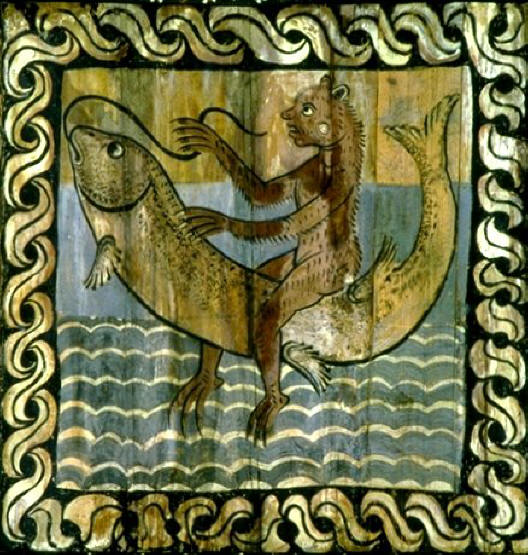 Die Decke von St. Martin zeigt in 153 Feldern Szenen des Alten und Neuen Testaments, aber auch seltsame Tiere und Fabelwesen. Auf den vier folgenden Bildern sehen Sie die Kirche (l.o.), die gesamte Decke (m.), einen Ausschnitt mit 12 Feldern (l.u.) und schließlich die "Vorlage" zu einem der Stickwerke (r.).